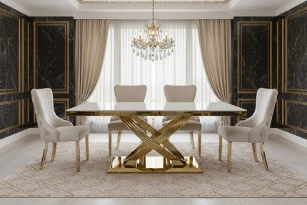 Price range: £1,400.00 through £1,750.00Rose Cream & Gold Dining Table Set | Mink & Lion Knocker Dining Chairs | Louis Dining Sets