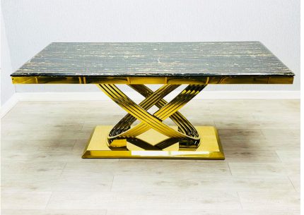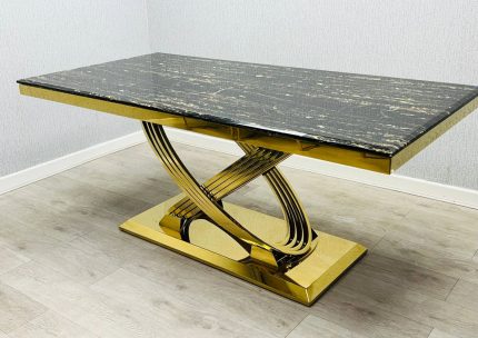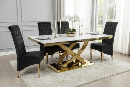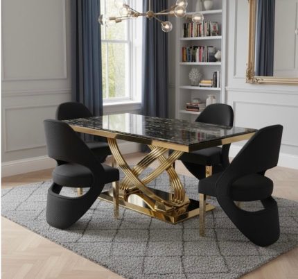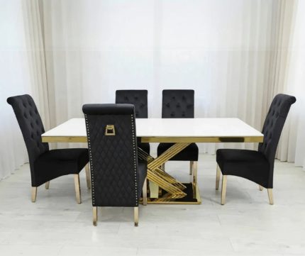 Price range: £1,450.00 through £1,850.00Rose 180cm Marble Dining Table Cream + Porado Dining Chairs Black And Gold | Louis Dining Sets