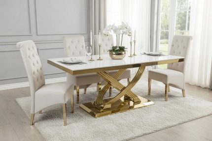 Rose 160cm Cream Marble Dining Table + Porado Cream And Gold Dining Chairs | Louis Dining Sets