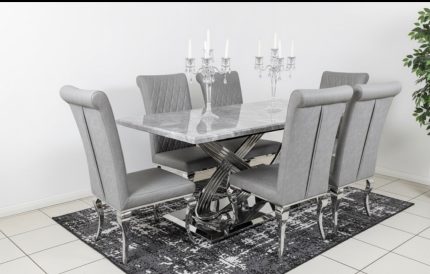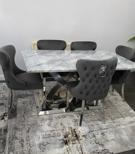 Rose 160cm Grey Marble Dining Table With Valentino Dark Grey Dining Chairs Lion Knocker | Louis Dining Sets