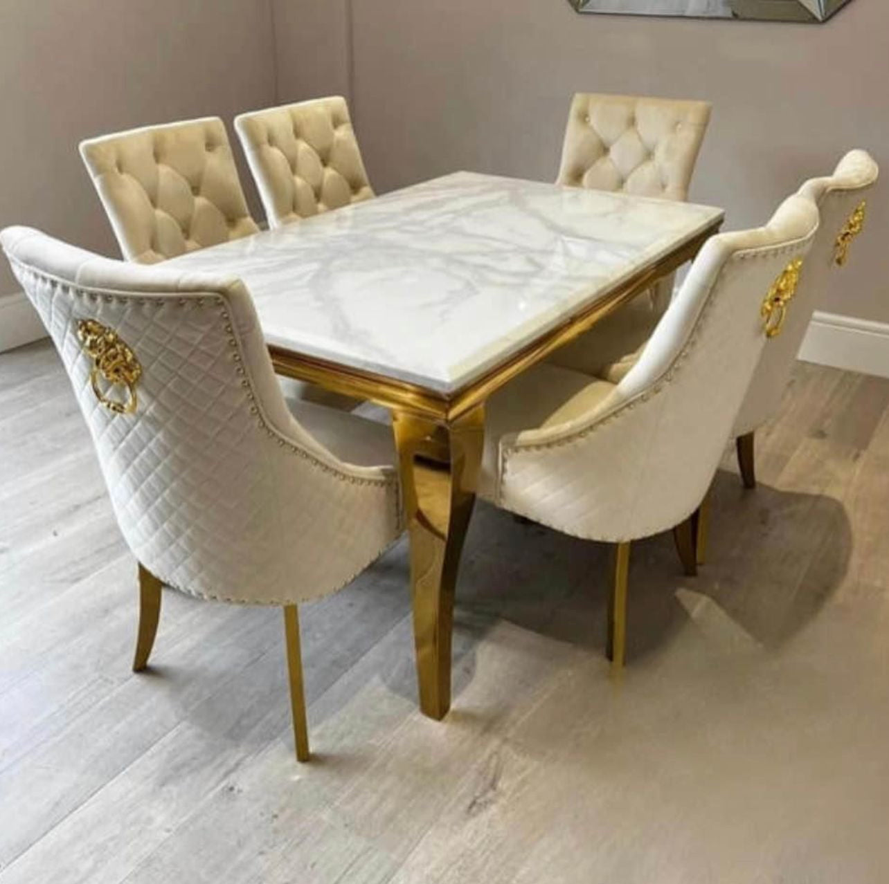 Louis Gold Table With Bentley Mink & Gold Dining Chairs Lion Knocker