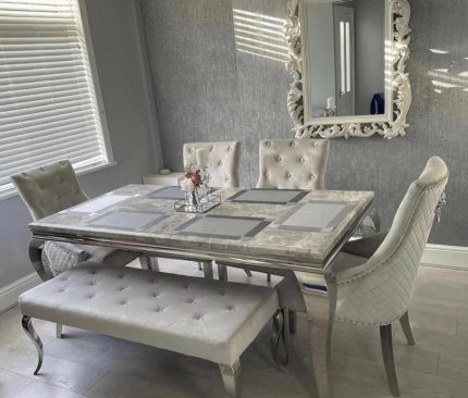 Louise Marble Dining Table Grey + 4 Majestic Lion Knocker Chairs And Bench