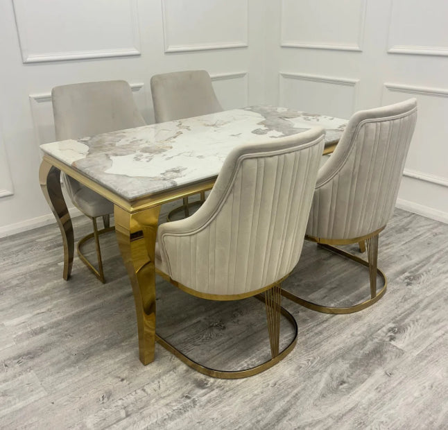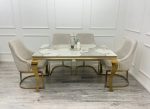 Louise Gold Marble Dining Table + Chelmsford Cream And Gold Dining Chairs