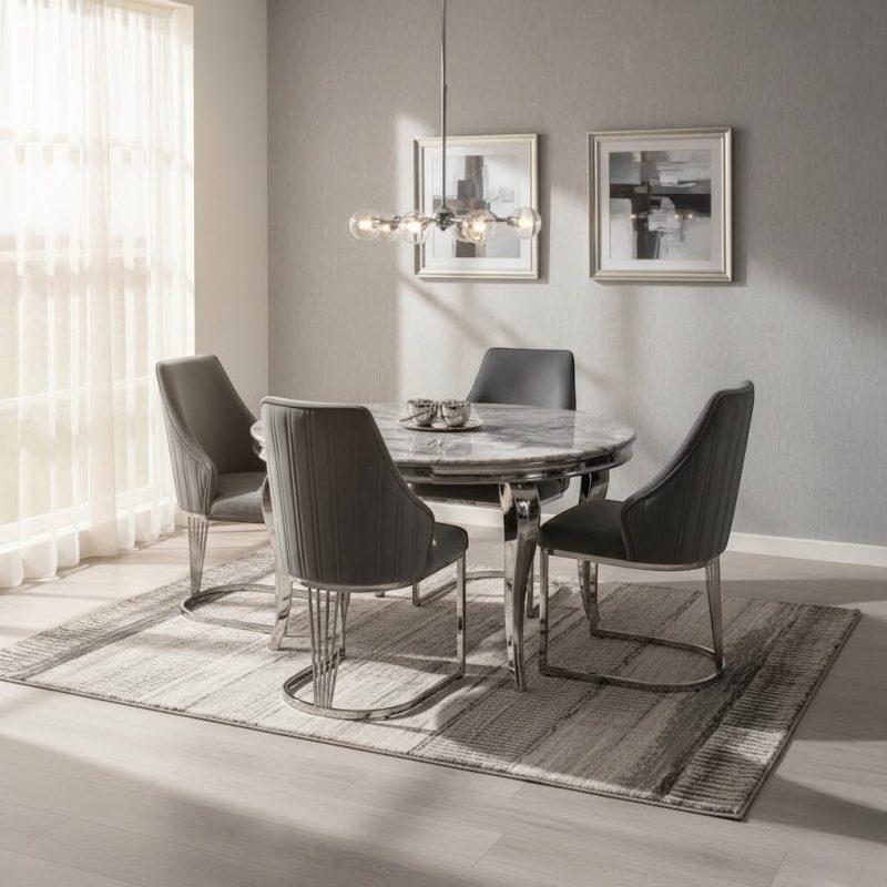 1.1M & 1.3M Grey Round Dining Table + 4 Lasco Dark Grey Dining Chairs | Louis Dining Sets