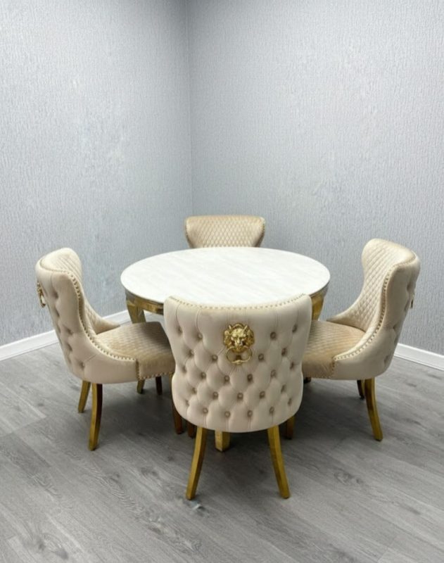 1.1M & 1.3M Louise Round Marble Dining Table + Cream Dining Chairs Lion knocker