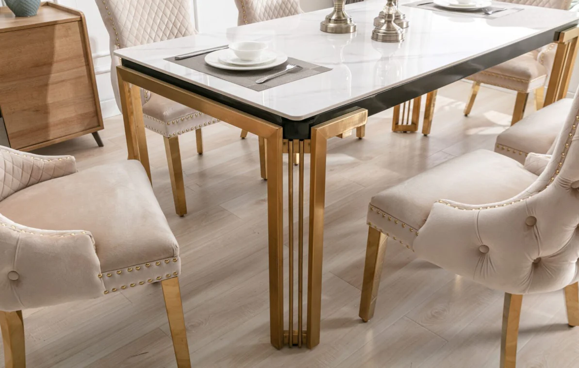 Bring a touch of luxury to your dining space with the Sorrento Rectangle Ceramic Table in elegant Cream and Gold. Featuring a durable ceramic top and a striking gold frame, this table is available in 150cm and 180cm sizes — the perfect blend of sophistication and style.